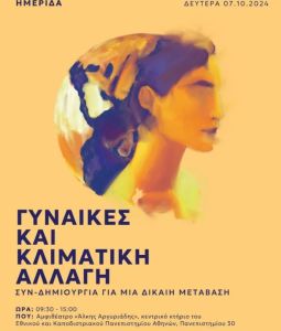 Ημερίδα με τίτλο «Γυναίκες και Κλιματική Αλλαγή: Συν-Δημιουργία για μια Δίκαιη Μετάβαση» θα πραγματοποιηθεί τη Δευτέρα 7 Οκτωβρίου 2024 στο Αμφιθέατρο «Άλκης Αργυριάδης», Πανεπιστημίου 30.