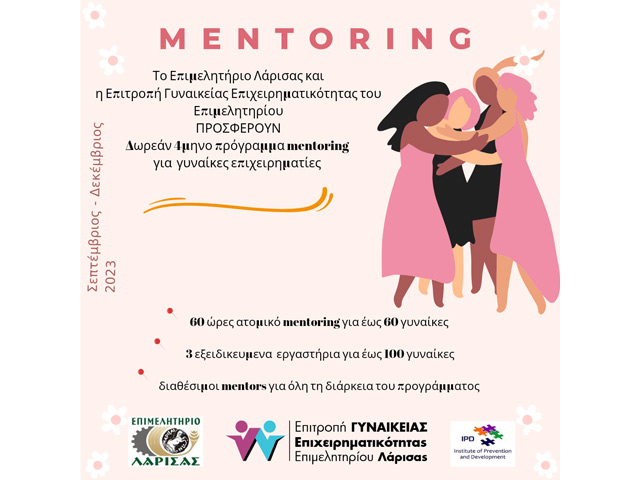 To Επιμελητήριο Λάρισας και η Επιτροπή Γυναικείας Επιχειρηματικότητας του Επιμελητηρίου προσφέρουν στις γυναίκες επιχειρηματίες και μελλοντικές επιχειρηματίες τετράμηνο πρόγραμμα mentoring, το οποίο θα διαρκέσει από τον Σεπτέμβριο έως τον Δεκέμβριο 2023.