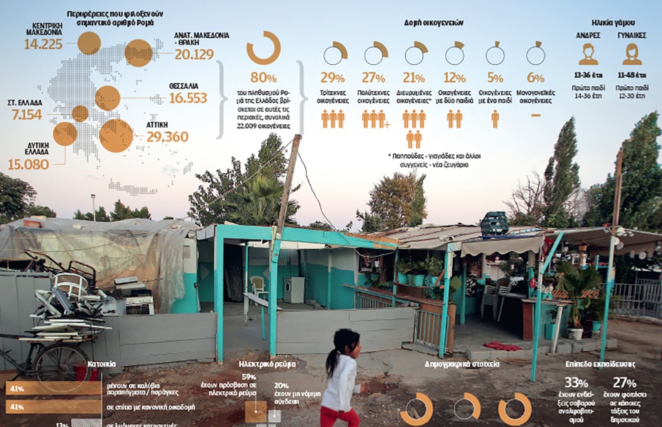 Οι Ελληνες Ρομά είναι κυρίως νεανικός πληθυσμός. Σε μεγάλο ποσοστό ζουν σε καταλύματα που δεν πληρούν τους όρους υγιεινής και επιβιώνουν είτε κάνοντας μεροκάματα όπου μπορούν είτε από τα κρατικά επιδόματα στήριξης. Εχουν χαμηλή έως και καθόλου εκπαίδευση και μεγάλη έλλειψη εξειδίκευσης, γεγονός που, σε συνδυασμό και με τα στερεότυπα που τους συνοδεύουν, τους δυσκολεύει να έχουν πρόσβαση στην αγορά εργασίας και έτσι να βελτιώσουν την κοινωνική και οικονομική θέση τους.