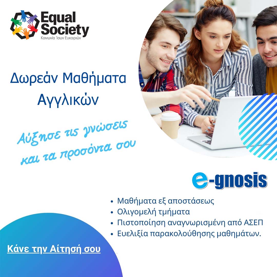 Η Equal Society, πιστή στο όραμα της για ίσες ευκαιρίες και στην εκπαίδευση για όλους, συνεχίζει τη δημιουργία ταχύρρυθμων τμημάτων. Επειδή, η πρόσβαση στην εκπαίδευση είναι δικαίωμα και όχι προνόμιο, μέσω του E-gnosis δίνεται η δυνατότητα σε όλους/ες να ενισχύσουν τις επαγγελματικές τους δεξιότητες με δωρεάν μαθήματα αγγλικών.