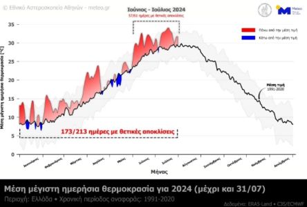 Από τις 213 ημέρες, στις 173 καταγράφηκαν θετικές αποκλίσεις στη θερμοκρασία -Το έτος 2024 πιθανότατα θα είναι το θερμότερο έτος για την Ελλάδα, αμέσως μετά το 2023