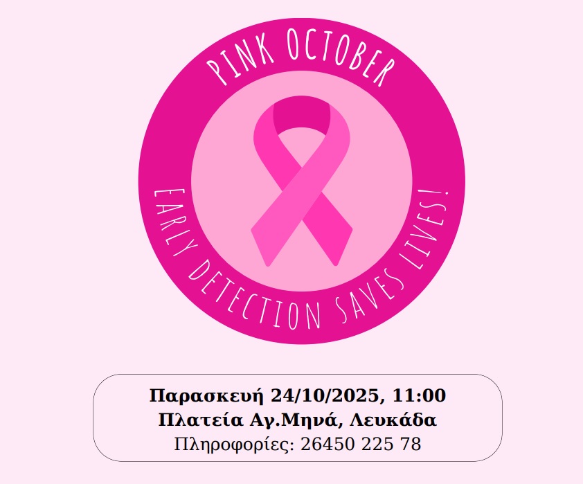Ο Οκτώβριος είναι μήνας ευαισθητοποίησης για τον καρκίνο του μαστού. Η Equal Society, ενώνει τις δυνάμεις της με τον Δήμο Λευκάδας, το Βοήθεια στο Σπίτι, το Κοινωνικό Παντοπωλείο, το Κέντρο Κοινότητας και τη Δημοτική Επιτροπή Ισότητας των Φύλων του Δήμου Λευκάδας για μια σημαντική δράση ενημέρωσης και ευαισθητοποίησης για τον καρκίνο του μαστού, την Παρασκευή 24 Οκτωβρίου 2025, στις 11:00 π.μ., στην Πλατεία Αγίου Μηνά στη Λευκάδα.