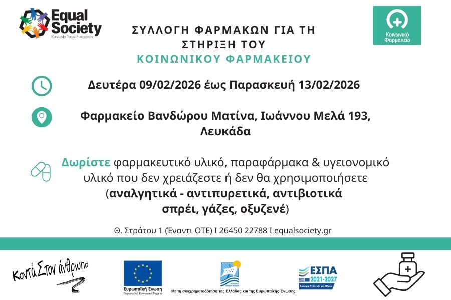 ΣΥΛΛΟΓΗ ΦΑΡΜΑΚΩΝ ΓΙΑ ΕΝΙΣΧΥΣΗ ΤΟΥ ΚΟΙΝΩΝΙΚΟΥ ΦΑΡΜΑΚΕΙΟΥ ΠΟΥ ΛΕΙΤΟΥΡΓΕΙ Η EQUAL SOCIETY ΣΤΟΝ ΔΗΜΟ ΛΕΥΚΑΔΑΣ